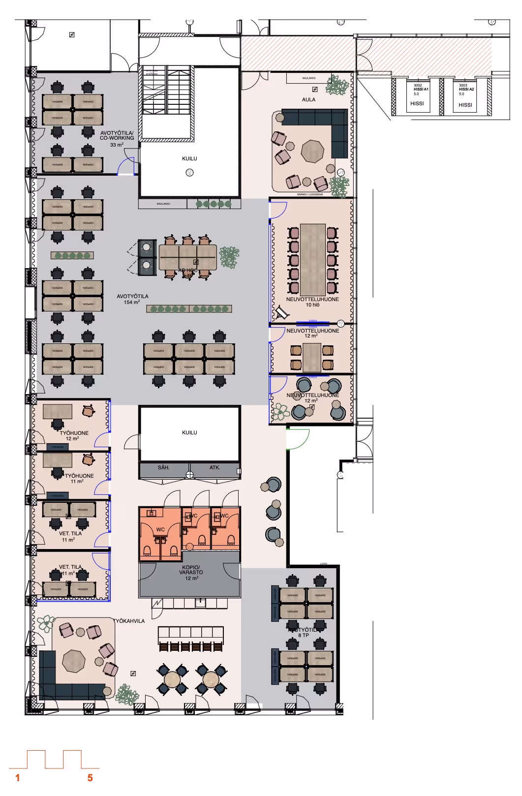 Laadukkaista materiaaleista valmistetut tilat ovat joustavasti muunneltavissa vuokralaisen tarpeisiin. Tilasuunnittelijat ovat käytettävissä tilojen suunnittelussa, varmistaen parhaan mahdollisen ratkaisun. Isot ja avarat ikkunat tuovat valoa sisään kaikkina vuodenaikoina, luoden viihtyisän ja miellyttävän työympäristön.